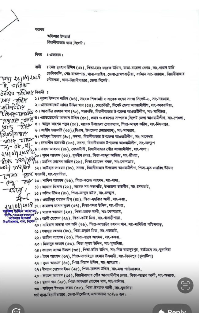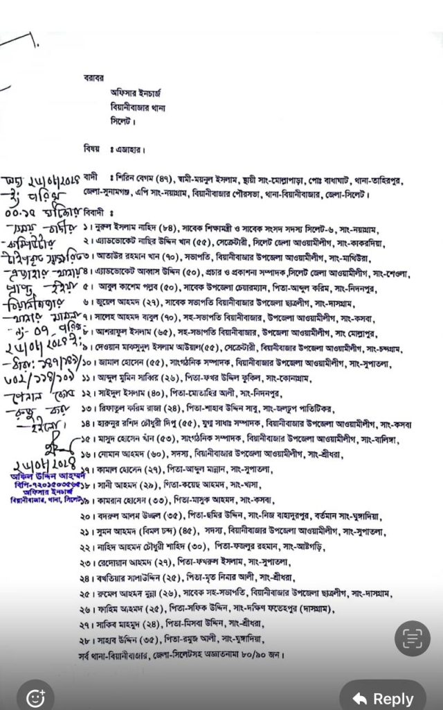 বিয়ানীবাজারে দু’হত্যা মামলায় নাহিদ-নাসির খানসহ আসামি দুই শতাধিক
